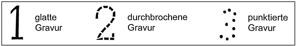 | Stempeltypen | Zahlensatz von 0-9, 15 mm Schrifthöhe, glatte Gravur, Zahlensatz von 0-9, 20 mm Schrifthöhe, Zahlensatz von 0-9, glatte Gravur, Zahlensatz von 0-9, 15 mm Schrifthöhe, durchbrochene Gravur, Zahlensatz von 0-9, 20 mm Schrifthöhe, durchbrochene Gravur, Zahlensatz von 0-9, 15 mm Schrifthöhe, punktierte Gravur, Zahlensatz von 0-9, 20 mm Schrifthöhe, punktierte Gravur, Buchstabensätze von A bis Z, 15 mm Schrifthöhe, glatte Gravur, Buchstabensätze von A bis Z, 20 mm Schrifthöhe, Zahlensatz von 0-9, glatte Gravur, Buchstabensätze von A bis Z, 15 mm Schrifthöhe, durchbrochene Gravur, Buchstabensätze von A bis Z, 20 mm Schrifthöhe, durchbrochene Gravur, Buchstabensätze von A bis Z, 15 mm Schrifthöhe, punktierte Gravur, Buchstabensätze von A bis Z, 20 mm Schrifthöhe, punktierte Gravur |